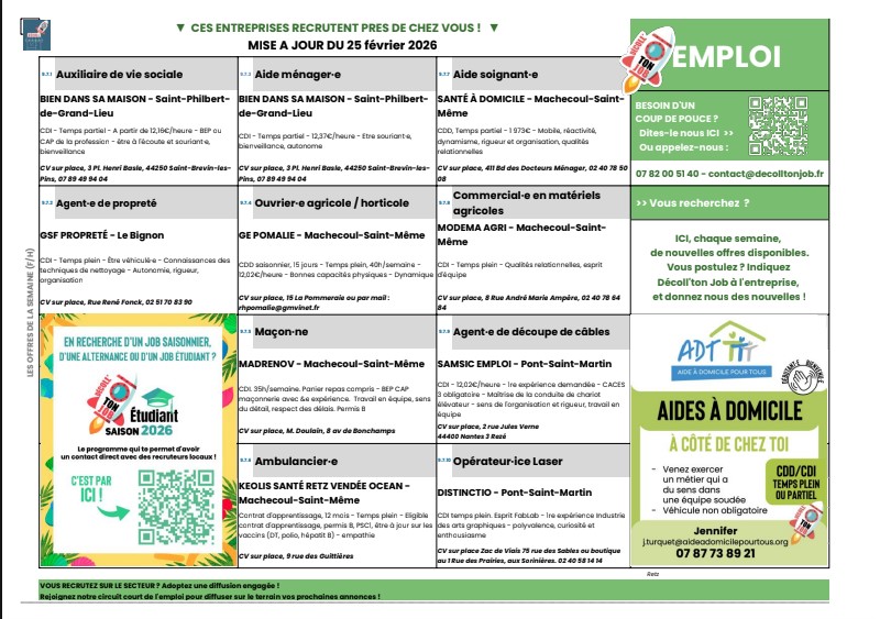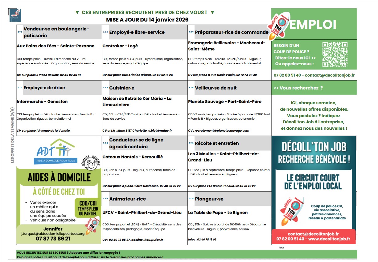 comme chaque semaine les offres d'emploi proposées par Décoll'ton job au niveau local.