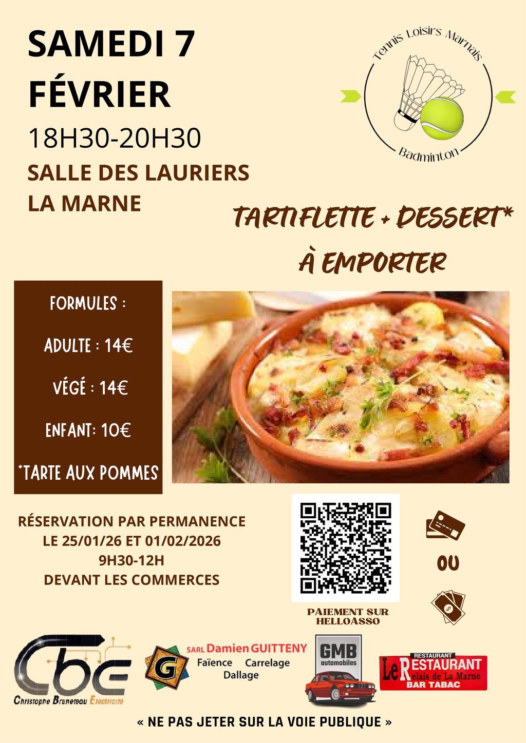Cette année, nous avons le plaisir de vous proposer une tartiflette, réalisée par le Relai de la Marne.