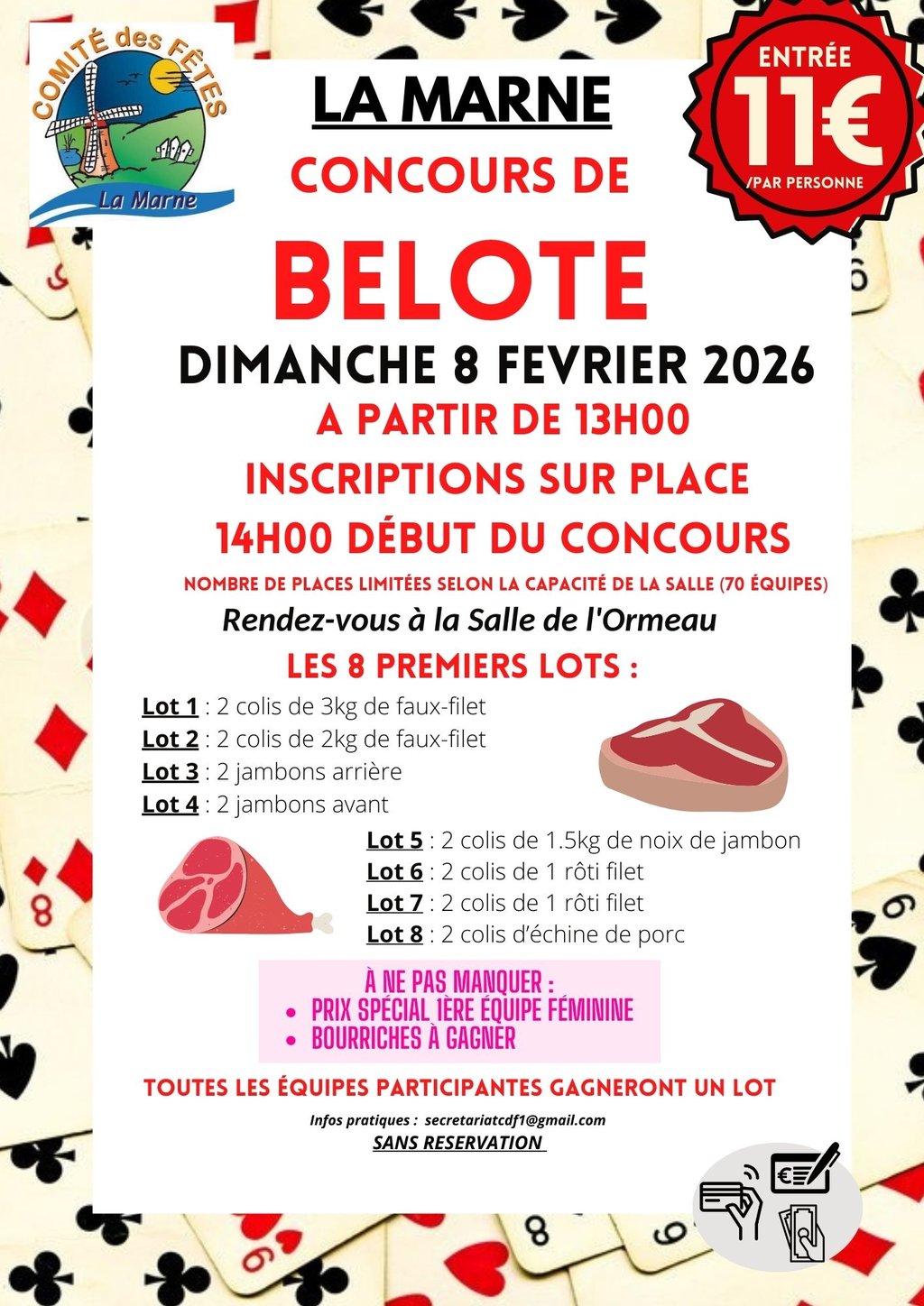 Le ComitĂ© des fĂȘtes a le plaisir de vous inviter Ă son tournoi annuel de belote, qui se dĂ©roulera le :